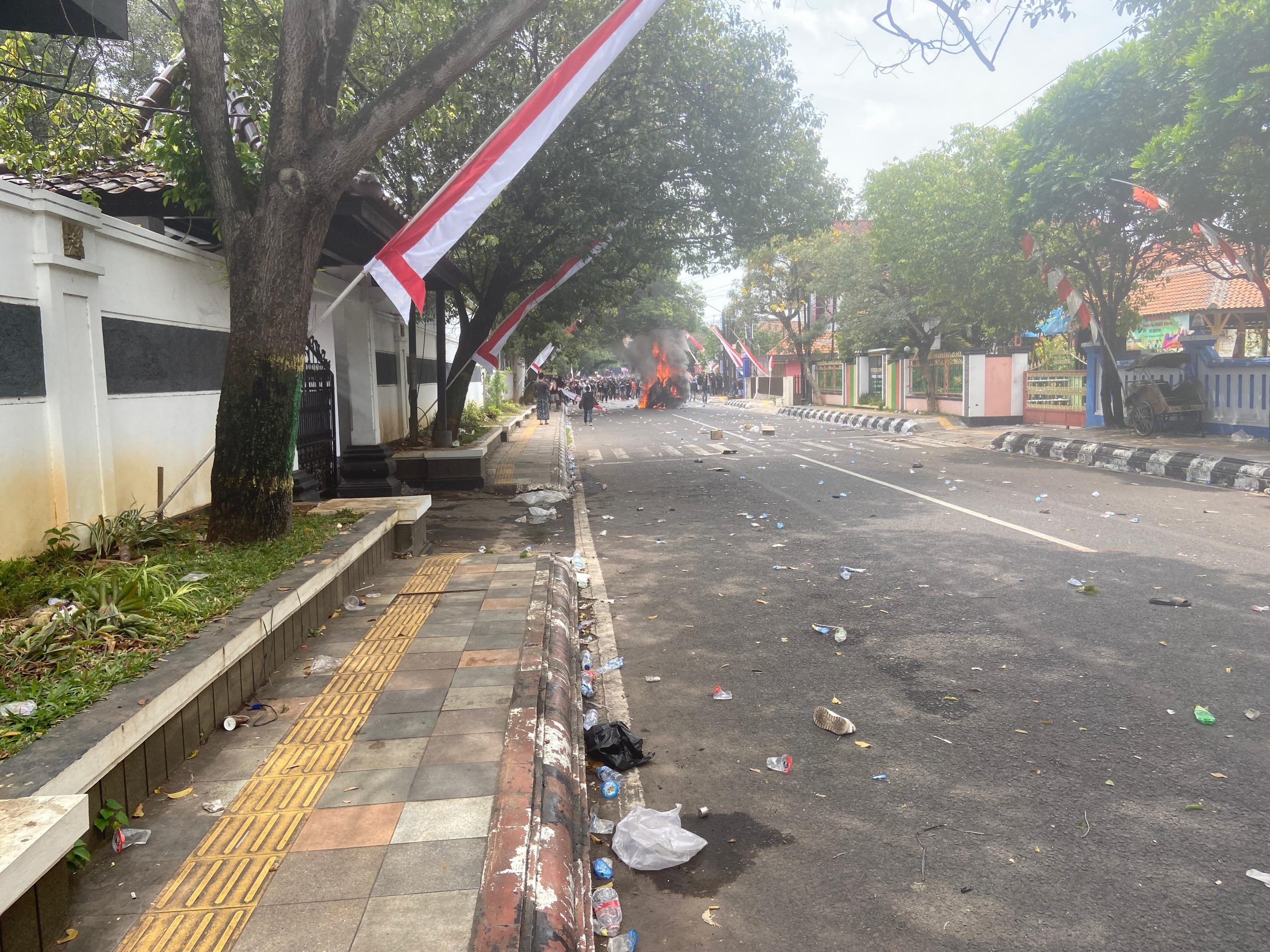 Berdasarkan informasi di lapangan, ketegangan mulai memuncak sekitar pukul 11.00 WIB ketika massa melempar botol air mineral, batu, dan telur busuk ke arah aparat. Polisi kemudian melakukan pendekatan persuasif serta memecah konsentrasi massa demi mencegah aksi meluas.