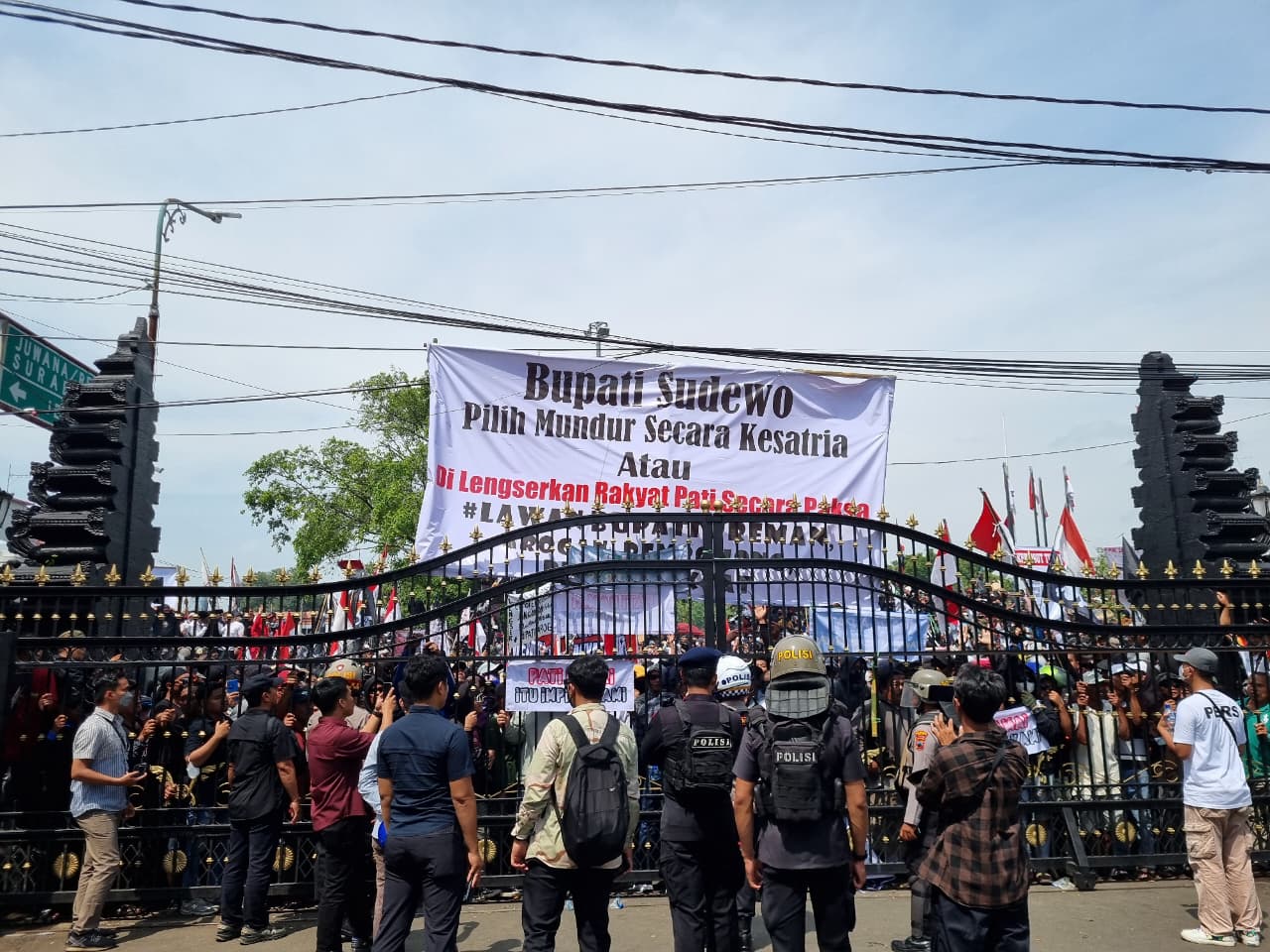 Kapolresta Pati Kombespol Jaka Wahyudi bersama Dandim 0718/Pati Letkol Arm Timotius Berlian Yogi Ananto turut turun tangan menenangkan massa. Keduanya bahkan naik ke panggung orasi untuk berdialog langsung dengan peserta aksi.
