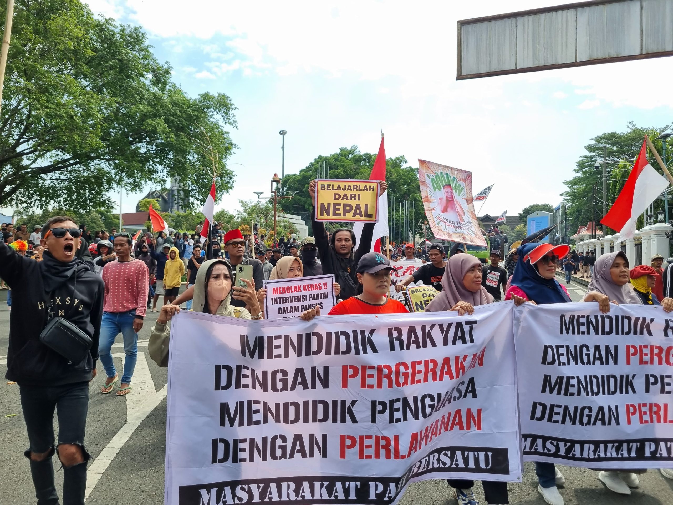 PATI – Ratusan massa yang tergabung dalam Aliansi Masyarakat Pati Bersatu (AMPB) menggelar aksi unjuk rasa di depan gedung DPRD Kabupaten Pati, Jumat (19/9/2025). Dalam aksinya, mereka menyuarakan 13 tuntutan yang ditujukan kepada DPRD maupun pimpinan partai politik di tingkat kabupaten.
