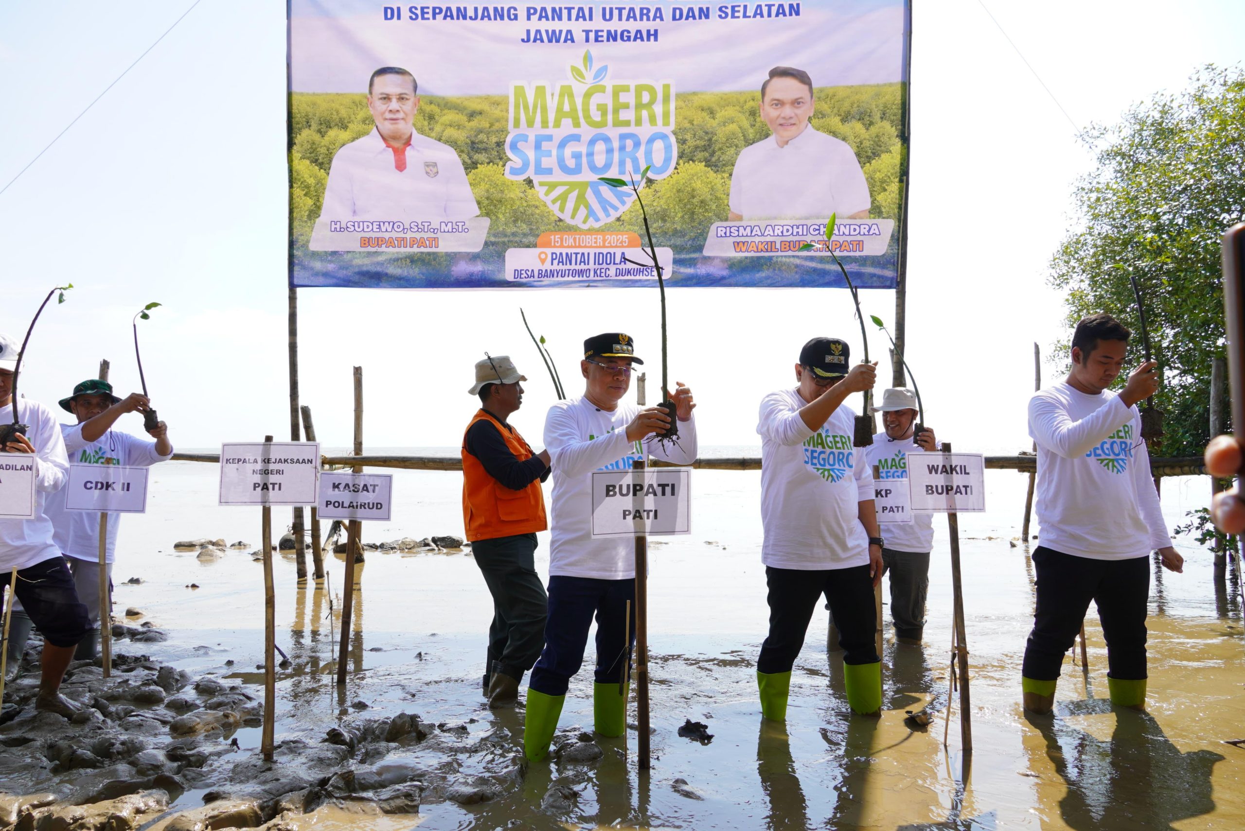 PATI – Bupati Pati, Sudewo, menghadiri kegiatan penanaman mangrove serentak dalam rangka program “Mageri Segoro” Tahun 2025 yang digagas oleh Gubernur Jawa Tengah. Kegiatan ini berlangsung di Pantai Idola Banyutowo, Kecamatan Dukuhseti, pada Rabu 15 Oktober 2025, dan diikuti oleh berbagai elemen masyarakat serta jajaran Forkopimda Kabupaten Pati.
