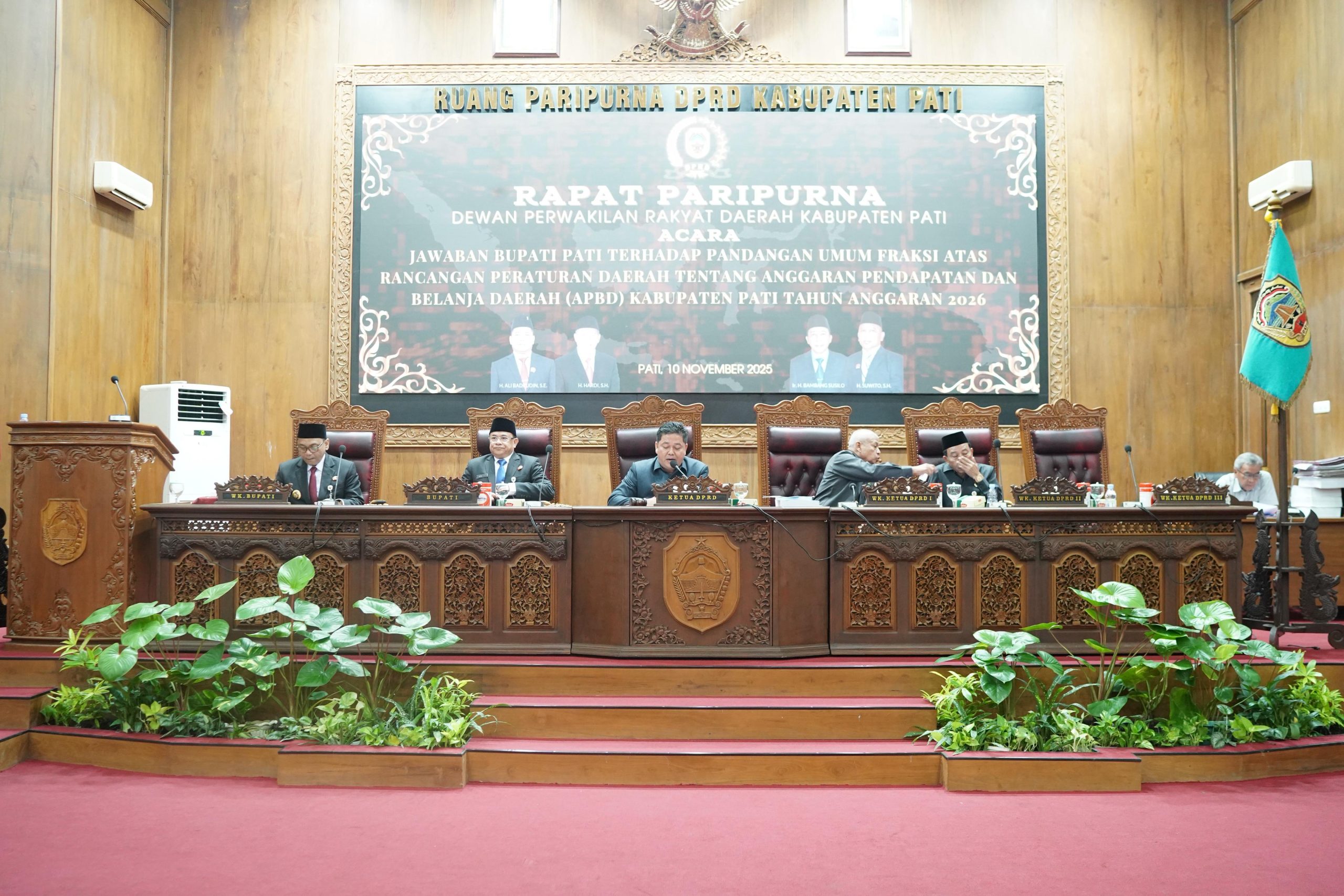 PATI, suarakabar.co.id – Dewan Perwakilan Rakyat Daerah (DPRD) Kabupaten Pati menggelar Rapat Paripurna dengan agenda penyampaian Jawaban Bupati Pati atas Pandangan Umum Fraksi-fraksi terhadap Rancangan Peraturan Daerah (Raperda) tentang APBD Kabupaten Pati Tahun Anggaran 2026.
